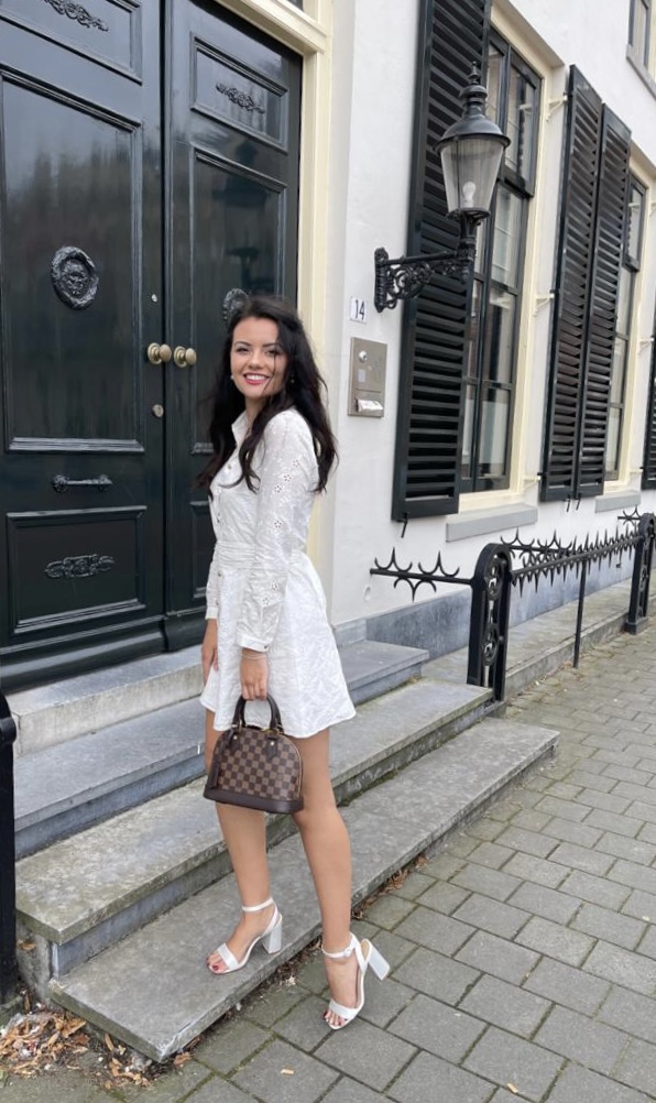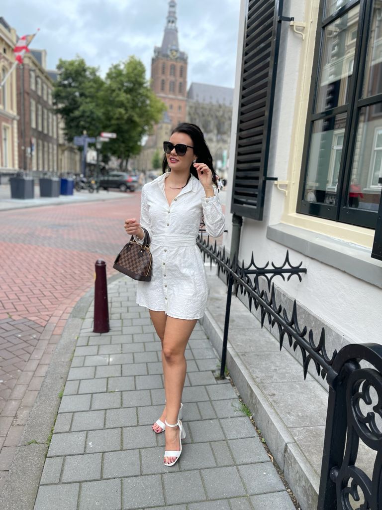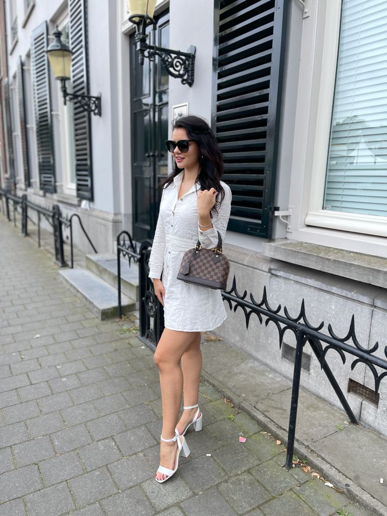 I tend to dress quite often for settings that requiere a simple sophisticated outfit, so this outfit is typically me. I opted for a white dress from ZARA S21 with broderie, white sandals with a chunky heel from Be Mine, earrings from Chanel, sunglasses from Gucci and the Alma bb in Damier from Louis Vuitton as a small handbag.