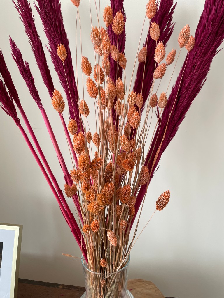 Next to our lounge area I created a smaller bouquet. I compiled pink died pampas grass with peach coloured dried grass. The colors are cohesive and add a pop of color to my neutral coloured lounge area. The pop of pink fits my personality and our interior, while making our lounge slightly more interesting. I believe it is a common misconception that elegance and sophistication, or luxury for that matter, has to be strictly in neutral colors. I believe that all colors found in nature can be added to an elegant and classy home, when used in a tasteful manner.