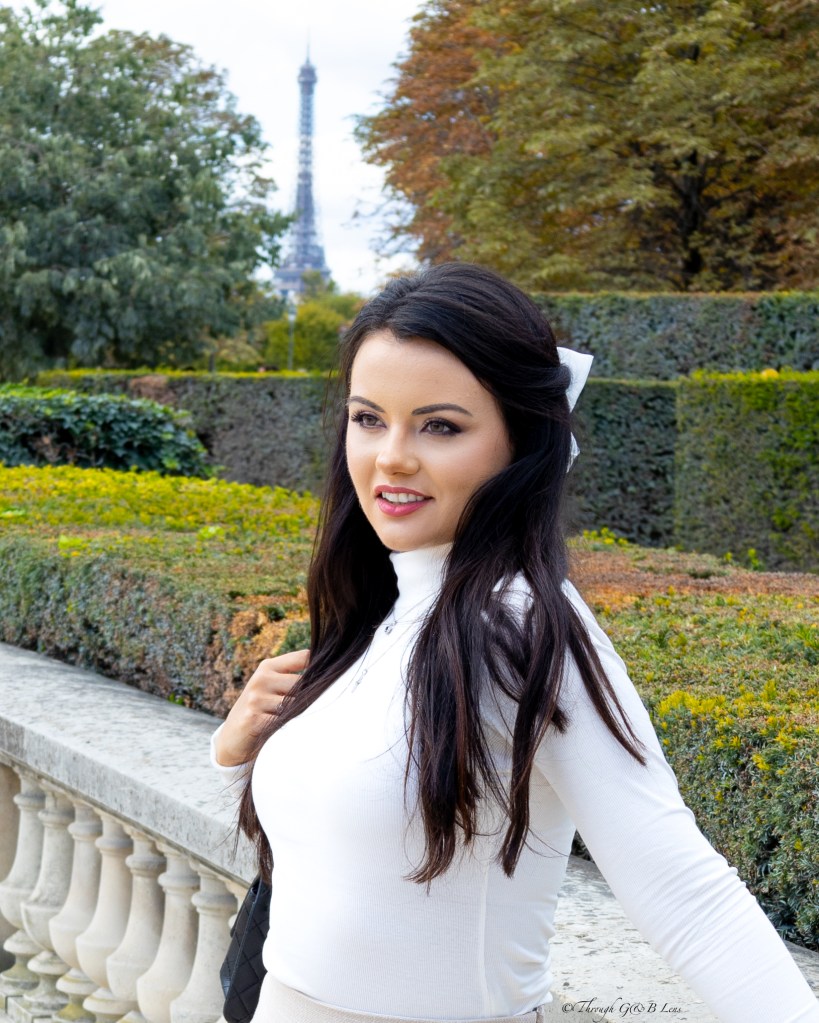 I combined a white turtle neck with a neutral mini skirt and matching Stuart Weitzman over the knee boots. In my hair I put a big white bow for that Blair Waldorf touch. I am carrying my beloved Chanel 2.55 reissue, as an ode to my favourite fashion house.